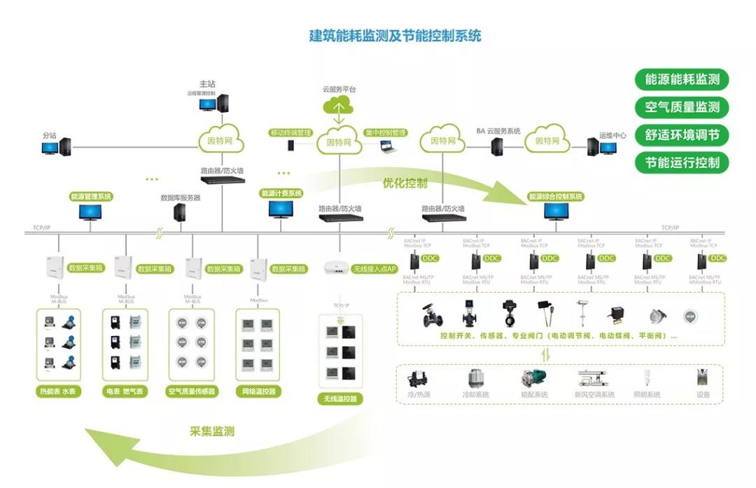 通過云平臺將能耗監(jiān)測系統(tǒng)和節(jié)能控制系統(tǒng)互聯(lián),通過各種傳感器和監(jiān)測軟件,實現(xiàn)對建筑內(nèi)各個環(huán)節(jié)各個區(qū)域的數(shù)據(jù)監(jiān)測,并對采集到的數(shù)據(jù)進行運算、優(yōu)化,再把優(yōu)化以后的數(shù)據(jù)運用到控制模塊,如機房的機主、管道系統(tǒng)的水泵、閥門,室內(nèi)的溫度、濕度、空氣質(zhì)量控制器等,有效調(diào)控這些設(shè)備的工作狀態(tài),最終實現(xiàn)整個建筑的舒適、健康和節(jié)能。