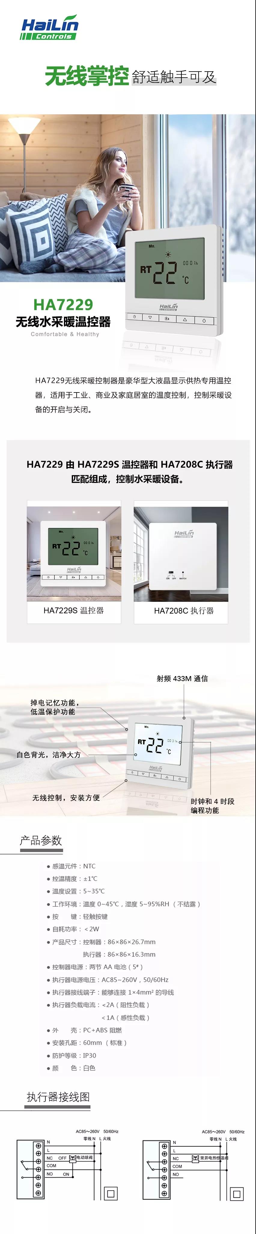 HA7229無線采暖控制器是豪華型大液晶顯示供熱專用溫控器,適用于工業、商業及家庭居室的溫度控制,控制采暖設備的開啟與關閉。