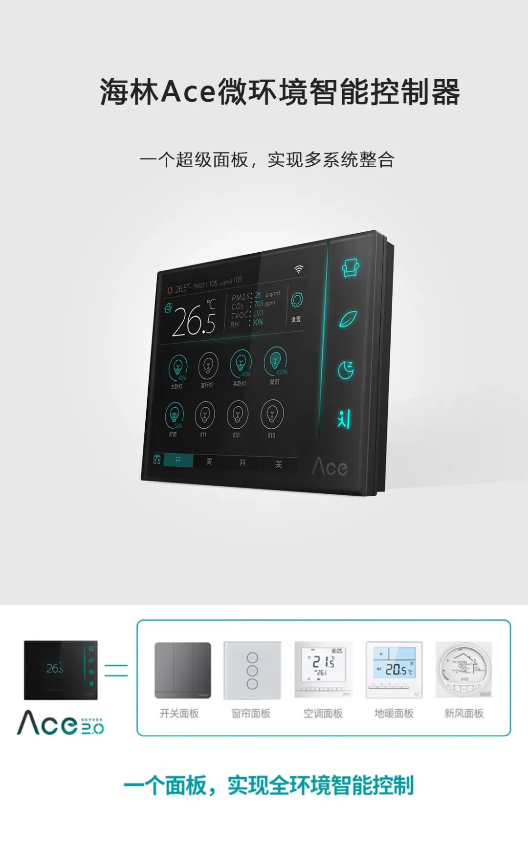 Ace將空調(diào)控制、采暖控制、新風控制、燈光控制、窗簾控制、溫度監(jiān)測、空氣質量監(jiān)測、能耗監(jiān)測等功能集于一身,一個面板融合房間所有開關,控制模塊分布安裝,控制面板弱點連接,極大地減少了布線及人工成本。