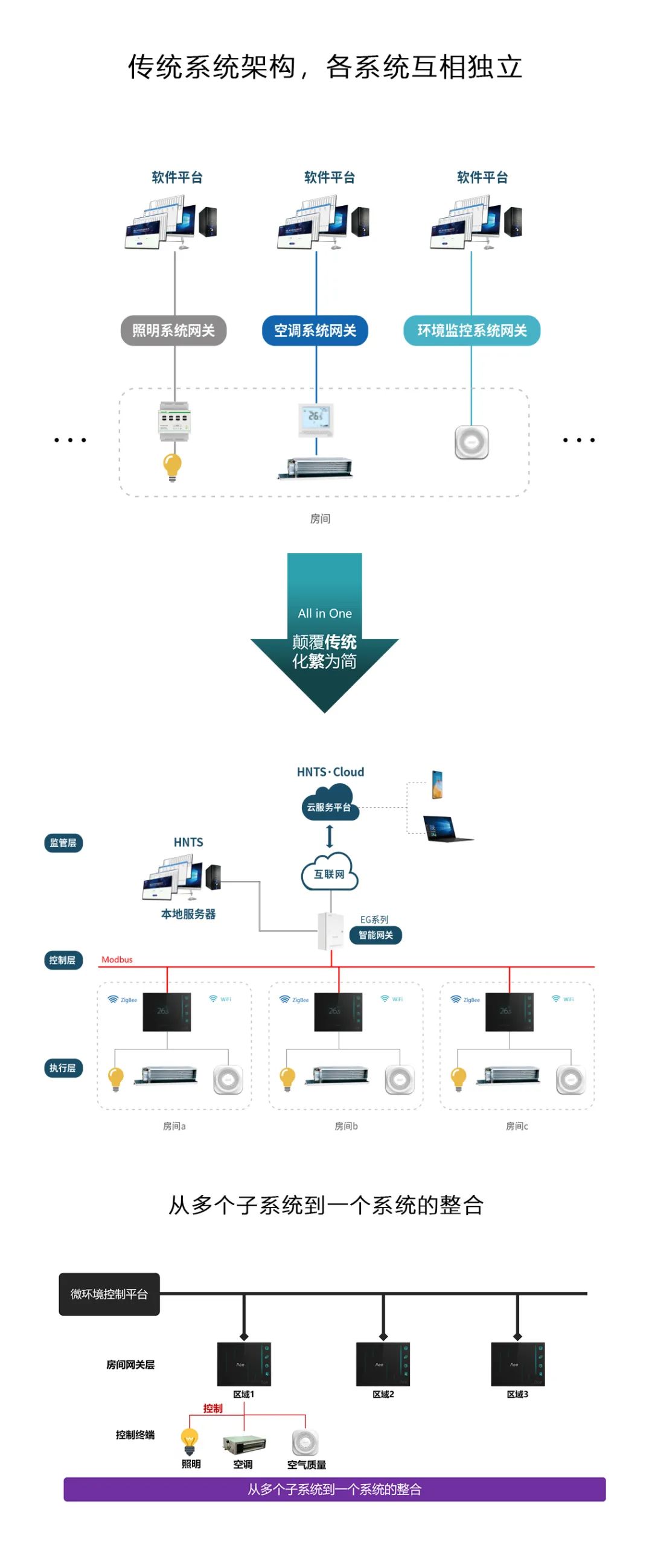 傳統(tǒng)智能化采用多系統(tǒng)方式,多個系統(tǒng)、多個軟件、多個總線。在前期施工成本上,多個系統(tǒng)需要多個網(wǎng)關、多條通訊總線以及需要控制線引到弱電設備間,費時費力,成本很高。