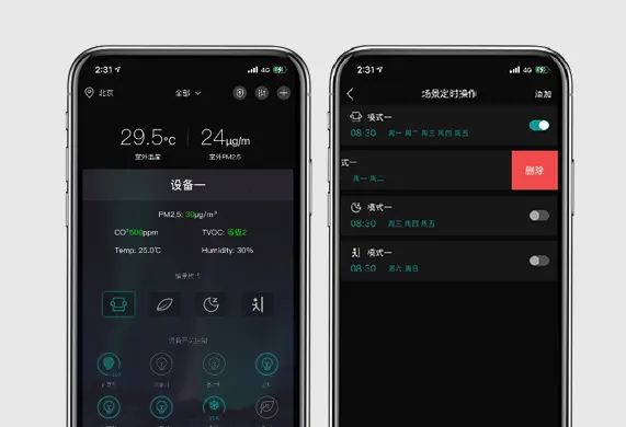 通過手機App,可以實現(xiàn)一鍵集中控制全屋的情景模式:一鍵全屋舒適、全屋節(jié)能等模式。也可以實現(xiàn)一鍵關空調(diào)、一鍵關燈等具體設備的具體控制。