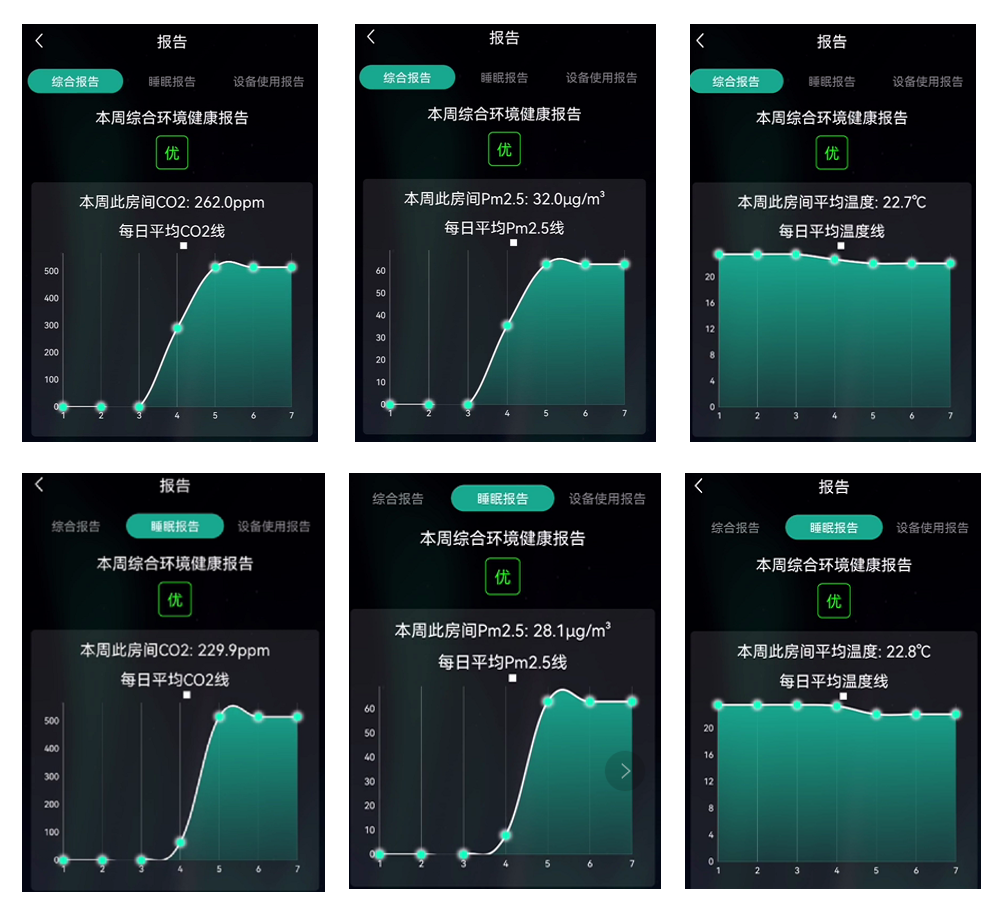 環(huán)境報告中會包含“綜合報告”、“睡眠報告”和“設備使用報告”,綜合報告和睡眠報告會對客戶的PM2.5、CO?和溫度進行評級,睡眠指的的睡眠期間而綜合是整體環(huán)境。