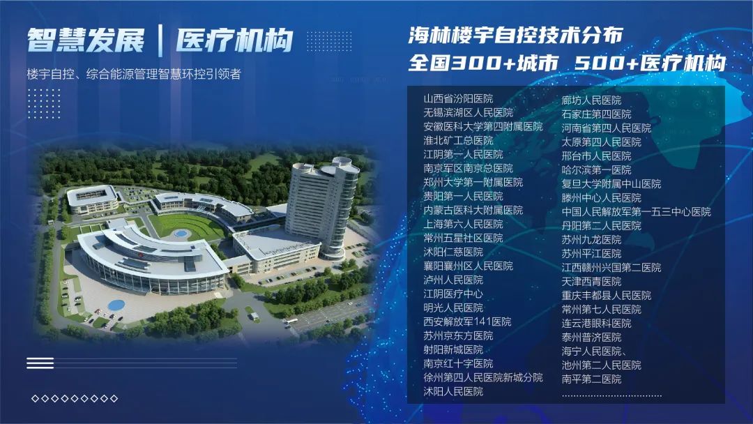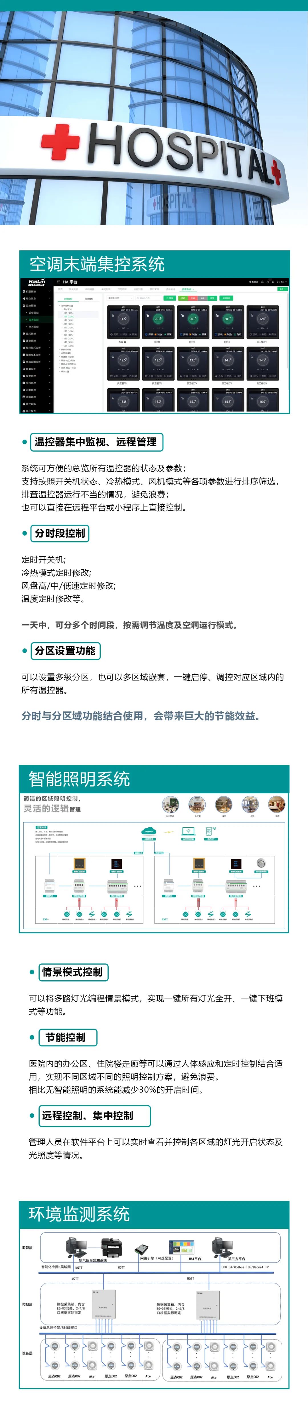 江蘇海林針對于現(xiàn)代醫(yī)院設(shè)計了樓宇智能管理系統(tǒng),集能耗分析和平臺集控于一體,將空調(diào)末端、智能照明、環(huán)境監(jiān)測、微環(huán)境管理、樓宇自控、能源管理、智慧水力平衡等系統(tǒng)集成到一個平臺,各子系統(tǒng)之間實現(xiàn)互聯(lián)互通,聯(lián)動控制。