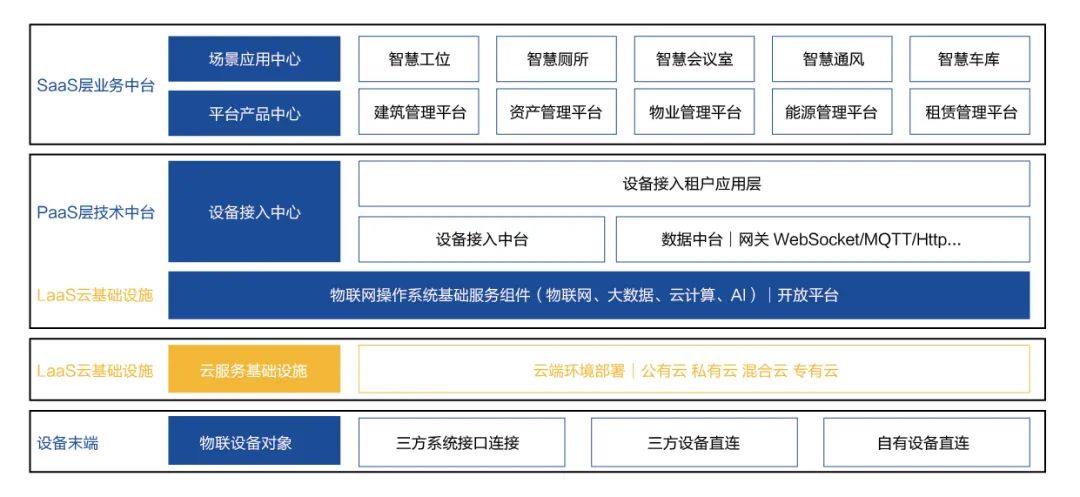 內容包含物業管理平臺與能源管理平臺,具體功能有設備管理、工單管理、中心駕駛艙、用戶管理、運維通知、能耗統計、能耗分析、故障監測診斷等。