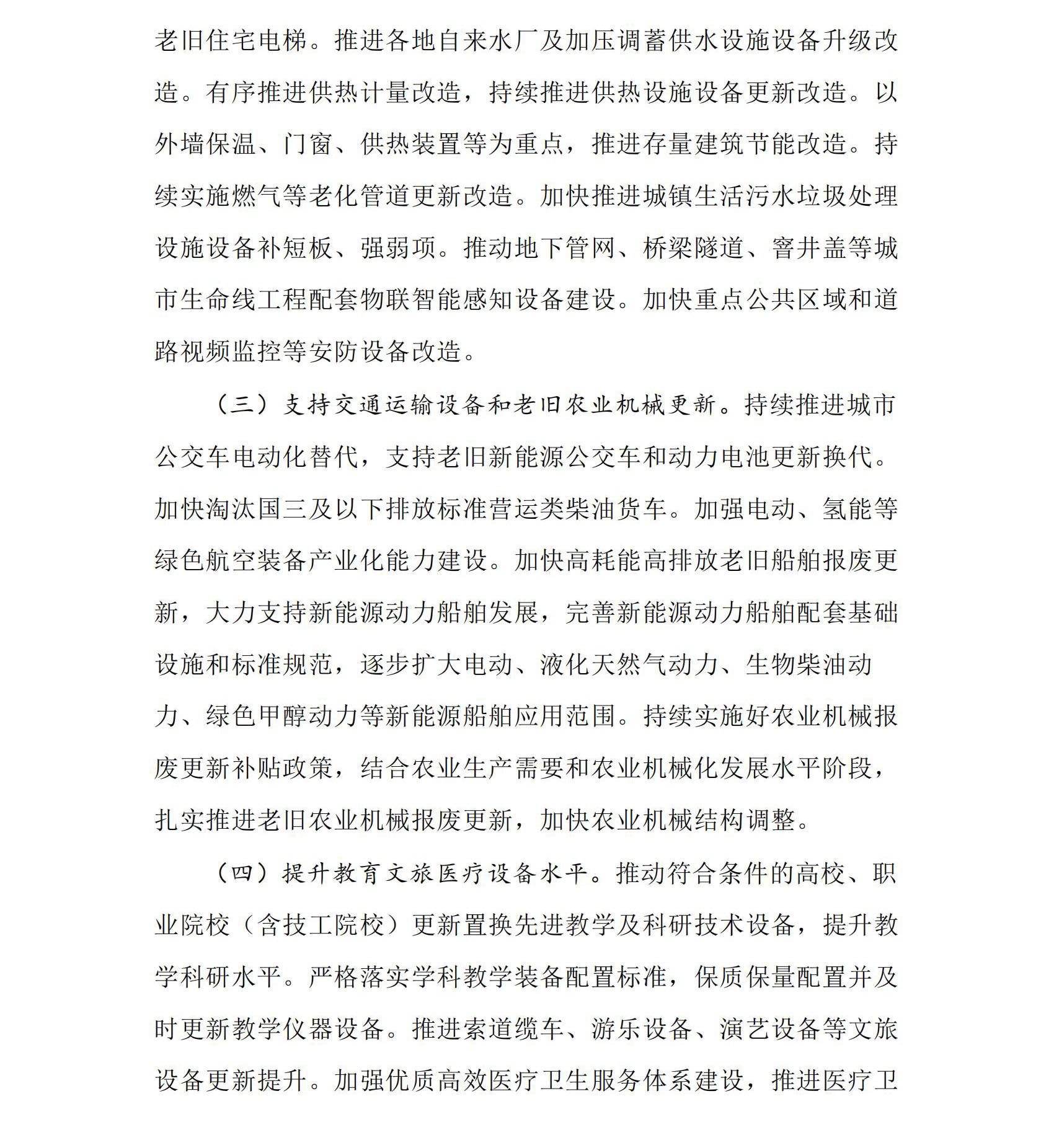 (二)加快建筑和市政基礎(chǔ)設(shè)施領(lǐng)域設(shè)備更新。圍繞建設(shè)新型城鎮(zhèn)化,結(jié)合推進(jìn)城市更新、老舊小區(qū)改造,以住宅電梯、供水、供熱、供氣、污水處理、環(huán)衛(wèi)、城市生命線工程、安防等為重點(diǎn),分類推進(jìn)更新改造。加快更新不符合現(xiàn)行產(chǎn)品標(biāo)準(zhǔn)、安全風(fēng)險(xiǎn)高的老舊住宅電梯。推進(jìn)各地自來水廠及加壓調(diào)蓄供水設(shè)施設(shè)備升級(jí)改造。有序推進(jìn)供熱計(jì)量改造,持續(xù)推進(jìn)供熱設(shè)施設(shè)備更新改造。以外墻保溫、門窗、供熱裝置等為重點(diǎn),推進(jìn)存量建筑節(jié)能改造。持續(xù)實(shí)施燃?xì)獾壤匣艿栏赂脑臁<涌焱七M(jìn)城鎮(zhèn)生活污水垃圾處理設(shè)施設(shè)備補(bǔ)短板、強(qiáng)弱項(xiàng)。推動(dòng)地下管網(wǎng)、橋梁隧道、窨井蓋等城市生命線工程配套物聯(lián)智能感知設(shè)備建設(shè)。加快重點(diǎn)公共區(qū)域和道路視頻監(jiān)控等安防設(shè)備改造。