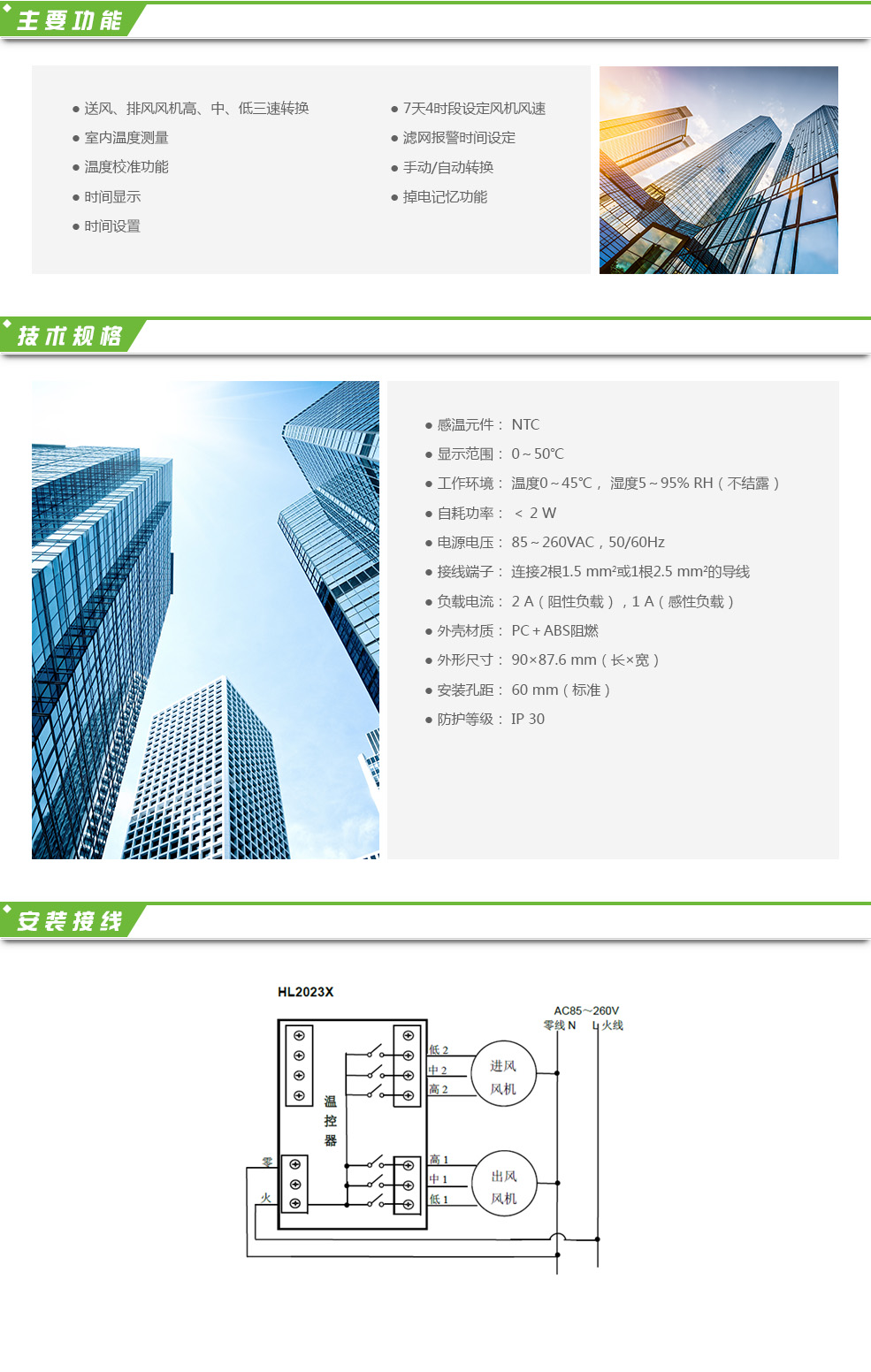 新風控制器HL2023X主要用于控制新風換氣機,設備包含兩臺風機,分別為送風機和排風機。通過控制器面板上的按鍵可以控制新風換氣機的啟停、速度的切換,手動/自動轉換,以及普通換氣與能量回收兩種工作模式的切換。采用靈敏的熱敏電阻作為感溫元件檢測室內溫度。